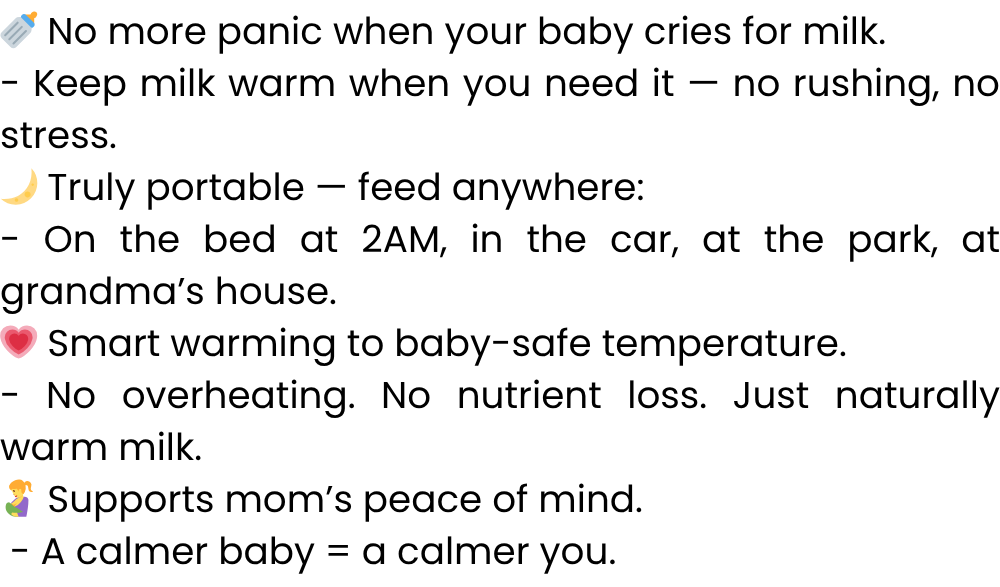 Parenthood is beautiful, but the constant pressure around feeding schedules can feel limiting. The Smartly Flexible™ Portable Bottle Warmer gives you that freedom back. Using gentle AcuTemp technology, it warms milk to the perfect nutrient - safe temperature anytime, anywheranywhere - in the car, at the park, even on a flight.